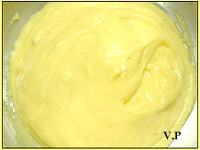 1)牛乳にバニラビーンズをさいた鞘と種も入れて、弱火でじっくり香りを移す。 2)卵黄とグラニュー糖を白っぽくなるまで混ぜ、薄力粉とコーンスターチも加え混ぜる。 3)@をゆっくり加えて混ぜ合わせたら中火にかける。 4)焦がさないように混ぜて、クリームが軽くなったところで火を止め、バターを加える。 5)ラップでぴったりと覆い、氷水で素早く冷ます。 6)使う時は、練り直して好みでリキュールを加える。 ★ポイント・牛乳にバニラビーンズを加えたら弱火で煮て香りを移す事。 |